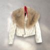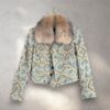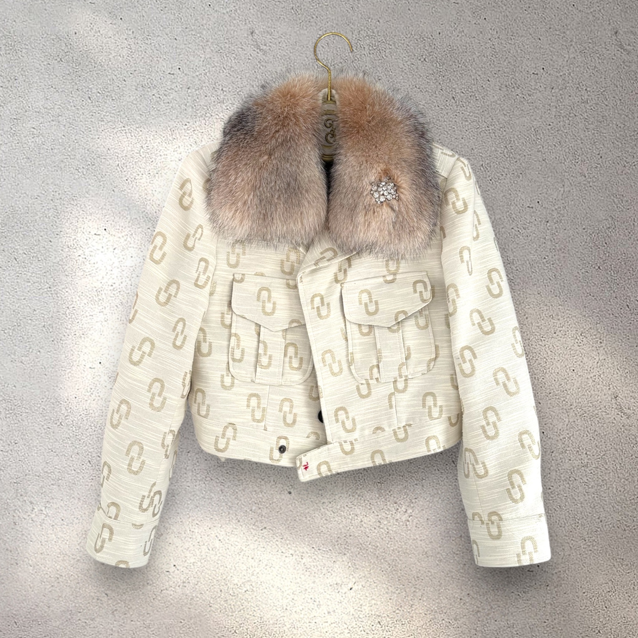 The Baumer in cream & gold jacquard with short fox collar in greige with brooch