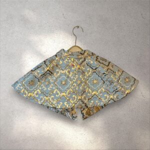 “The Baumer” reimagines our coveted vintage 1940s-1950s “Ike” military field jacket. Drawing inspiration from our sought-after one-of-a-kind collection, we’ve crafted a bold new iteration in our luxurious light blue and gold jacquard fabric from France.