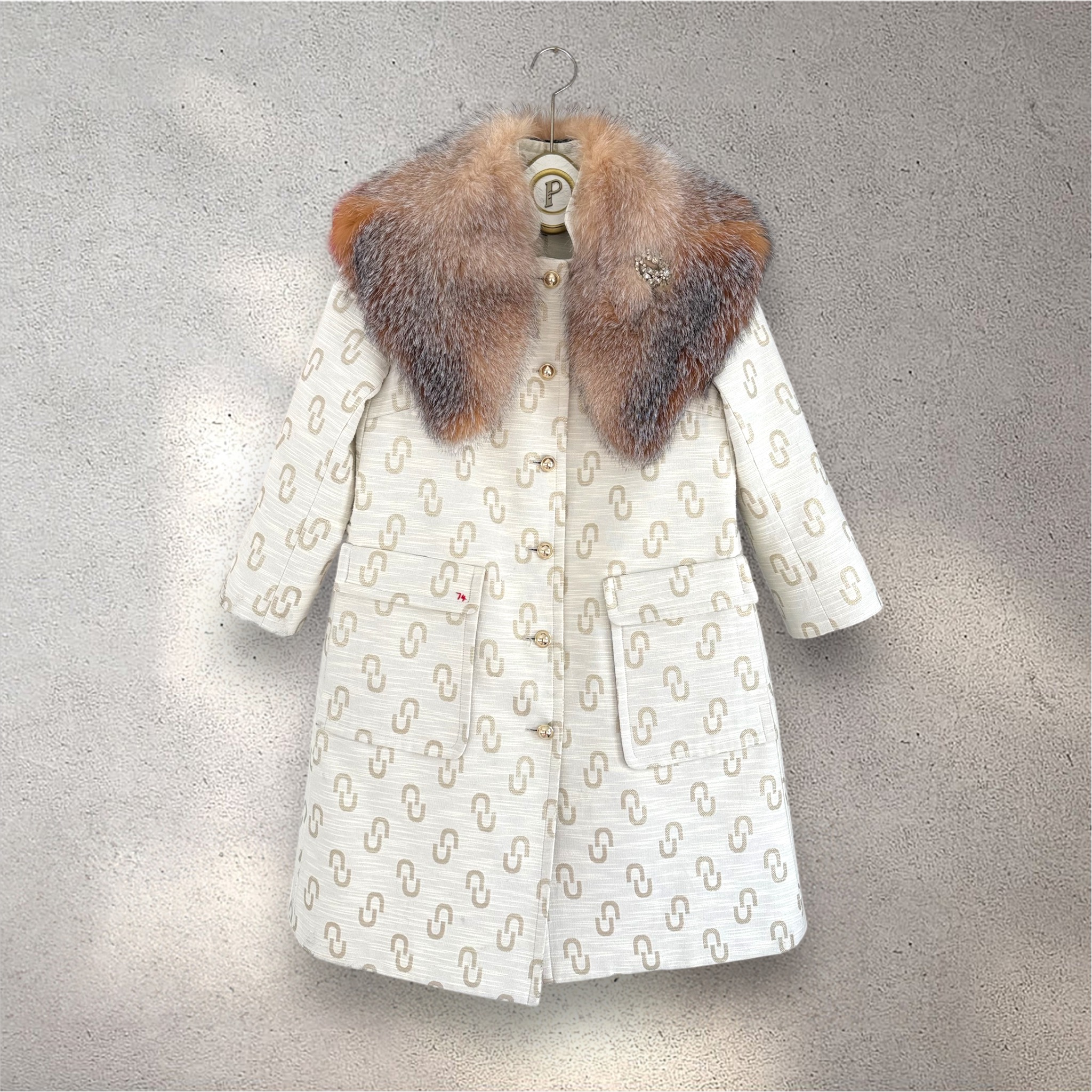 The Margery in cream and gold jacquard with large notch greige fox fur collar & vintage brooch