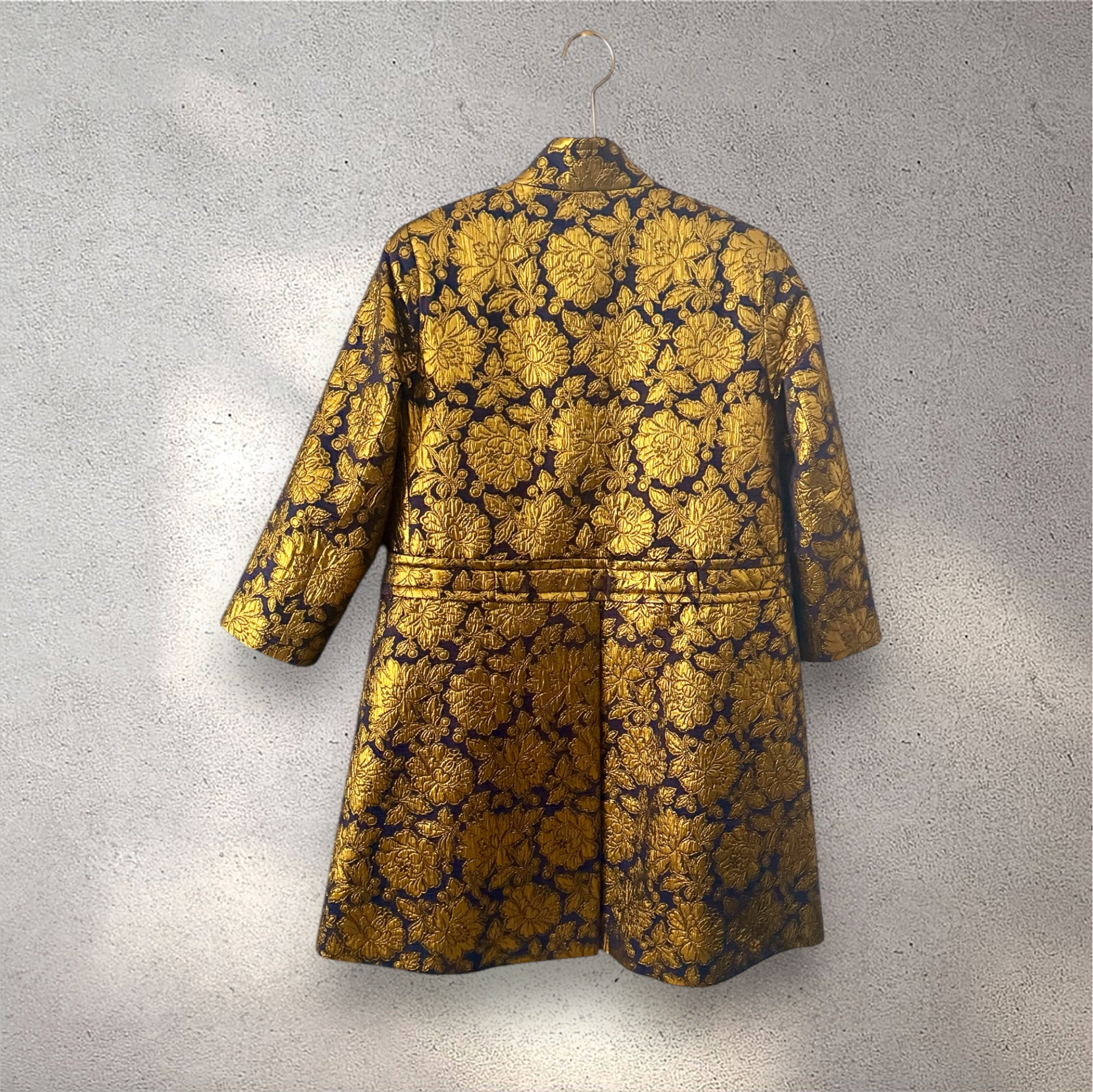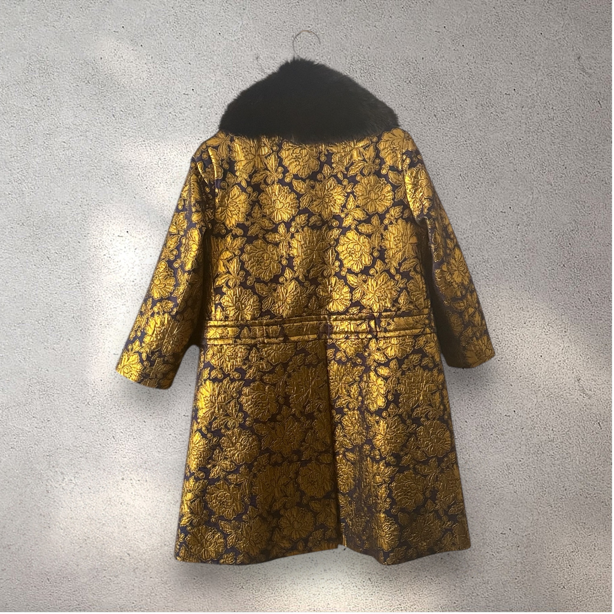 A swing silhouette jacket inspired by vintage pieces from the designer’s personal collection. Constructed with Italian tailoring techniques and crafted from luxurious jacquard fabrics. In photos, size medium Margery jacket in Navy and gold jacquard with a long black fox collar and vintage brooch.