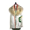 This jacket is a MEDIUM CROPPED length, featuring a detachable vintage black real fur collar complemented by a vintage rhinestone brooch. All patches on the jacket are original to this particular piece.